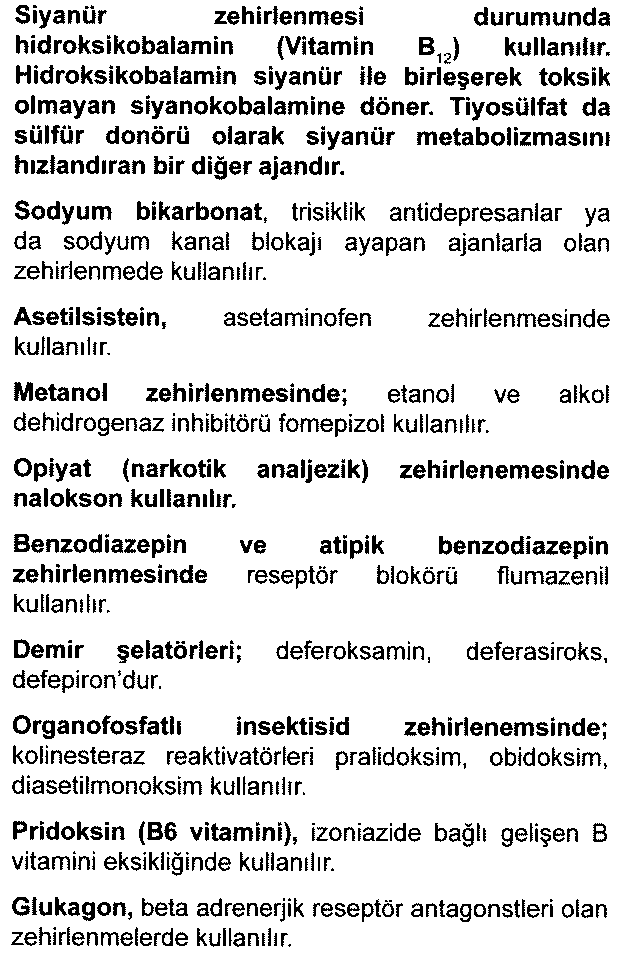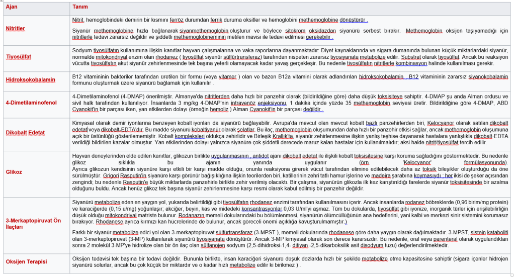 Siyanür zehirlenmesinde antidot olarak, Oksijen, sodyum tiyosülfat, amil nitrit , sodyum nitrit, 4-dimetilaminofenol, hidroksokobalamin ve dikobalt edetat (‘ Kelocyanor’) kullanılır.