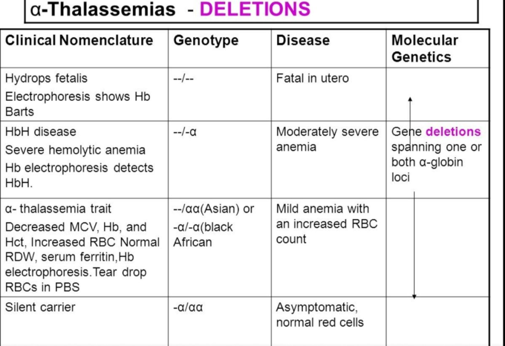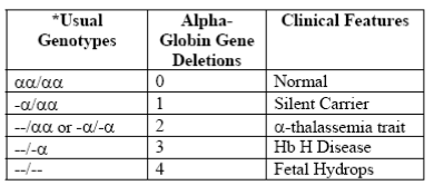 Ağır alfa talasemi taşıyıcıları, iki α-globin geninin delesyonunu (-α/-α veya – -/αα) içerir, klinik olarak normal olsalarda beta talasemi taşıyıcılarındaki hematolojik bulgulara sahiptirler.