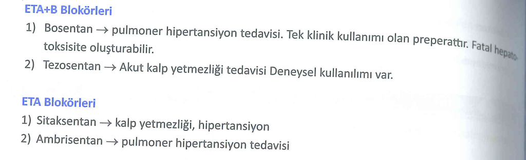 1-Endotelin A reseptörlerini etkileyen seçici ETA reseptör antagonistleri (sitaxentan , ambrisentan , atrasentan, sparsentan , zibotentan , avosentan , edonentan , aprositentan , klazosentan) .