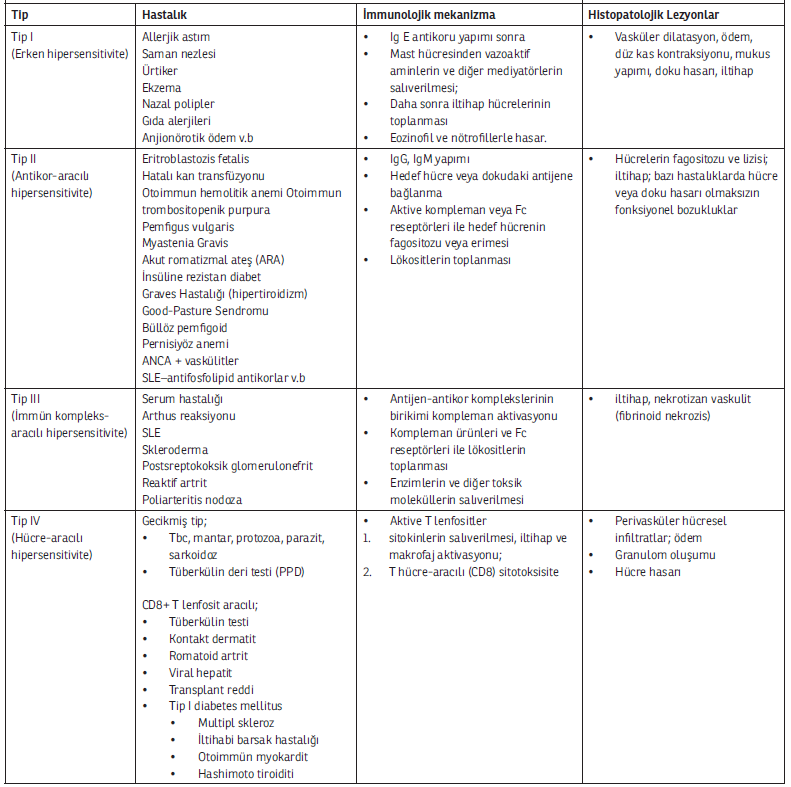 | Tip IV (Hücre-aracılı Hipersensitivite) | Gecikmiş tip: Tbc, mantar, protozoa, parazit, sarkoidoz, tüberkülin deri testi (PPD). CD8+ T lenfosit aracılı: Tüberkülin testi, kontakt dermatit, romatoid artrit, viral hepatit, transplant reddi, Tip I Dia1betes mellitus, Multipl skleroz, iltihabî barsak hastalığı, otoimmün miyokardit, Hashimoto tiroiditi. | * 1. Aktive T lenfositlerin sitokinlerin salıverilmesi, iltihap ve makrofaj aktivasyonu. * 2. T hücre-aracılı (CD8) sitotoksisite. | * Perivasküler hücresel infiltratlar, ödem. * Granülom oluşumu. * Hücre hasarı. |