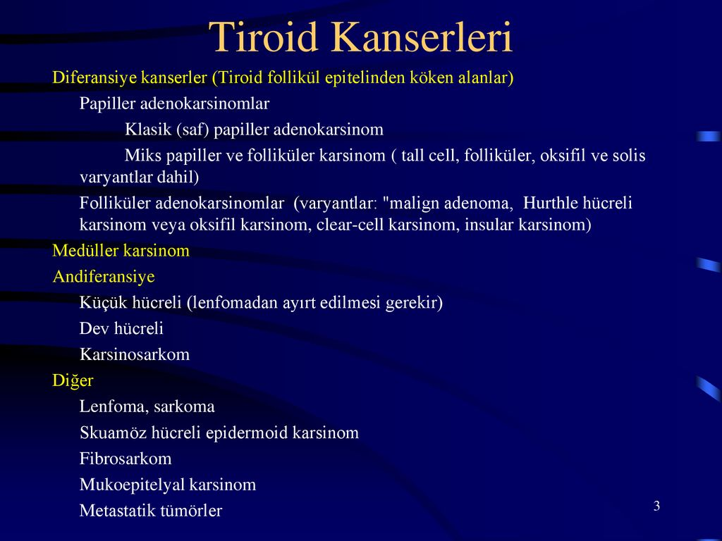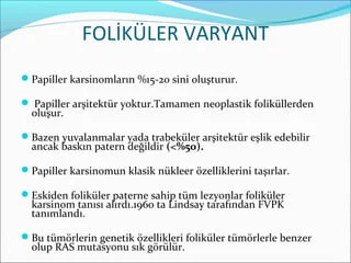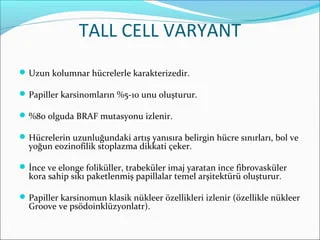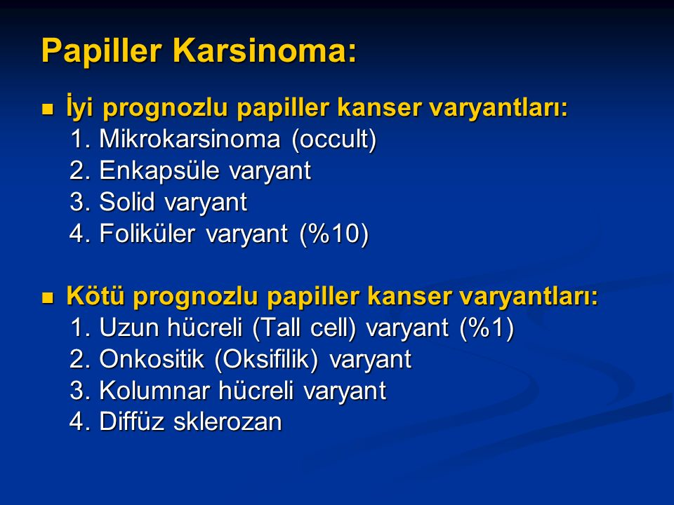 Papiller tiroid kanserinin en sık görülen formu foliküler varyantdır. Daha nadir görülen tipleri tall cell, kolumnar, diffüz, sklerozan, solid ve trabeküler tiplerdir. Bunlar içerisinde en iyi prognozlu olan foliküler varyant papiller karsinomdur. En kötü prognozlu ise tall cell varyantıdır