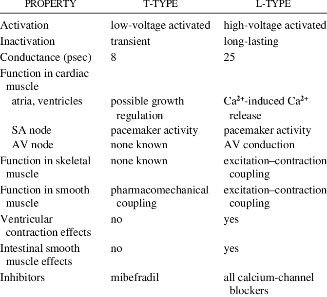T-tipi kalsiyum kanalları, hücre zarı hiperpolarizasyonu sırasında inaktive olan ancak daha sonra depolarizasyona açılan, düşük voltajla aktifleşen kalsiyum kanallarıdır . Kalsiyumun çeşitli hücrelere girişi, bununla ilişkili birçok farklı fizyolojik tepkiye neden olur. Kalp kası hücresi ve düz kas hücrelerinde voltaj bağımlı kalsiyum kanalı aktivasyonu, sitozolik konsantrasyonun artmasına izin vererek doğrudan kasılmayı başlatır. T-tipi kalsiyum kanallarının yalnızca kalp ve düz kaslarda mevcut olduğu bilinmiyor, aynı zamanda merkezi sinir sistemindeki birçok nöron hücresinde de mevcut olduğu biliniyor. 1970’lerdeki farklı deneysel çalışmalar, T tipi kalsiyum kanallarının (geçici açılan kalsiyum kanalları) halihazırda iyi bilinen L tipi kalsiyum kanallarından (Uzun Ömürlü kalsiyum kanalları) ayrılmasına olanak sağladı . Yeni T tipi kanallar, daha negatif membran potansiyelleri tarafından aktive edilebilme yetenekleri nedeniyle L tipi kalsiyum kanallarından çok farklıydı, küçük tek kanal iletkenliğine sahipti ve ayrıca mevcut kalsiyum antagonisti ilaçlara yanıt vermiyordu.