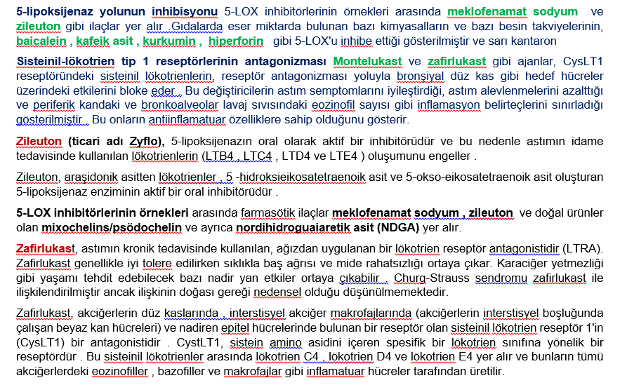 Lökotrienler araşidonik asit yolağının altivasyonuyla oluşurlar. Lökotrien D reseptörlerinin blokajı egzersizle oluşan astma tedavisinde etkin bir yöntemdir.