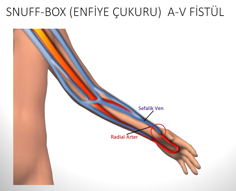 Snuff-box (enfiye çukuru) AV Fistül yada end to side şeklinde sefalik ven-radial arter anostomozu 10 Haziran 2024 yazar drtanjuy