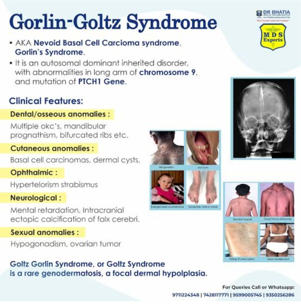Gorlin Sendromu; Nadir, otozomal dominant bir tablodur. Hayatın erken yaşlarında çok sayıda bazal hücreli karsinomla karakterizedir.