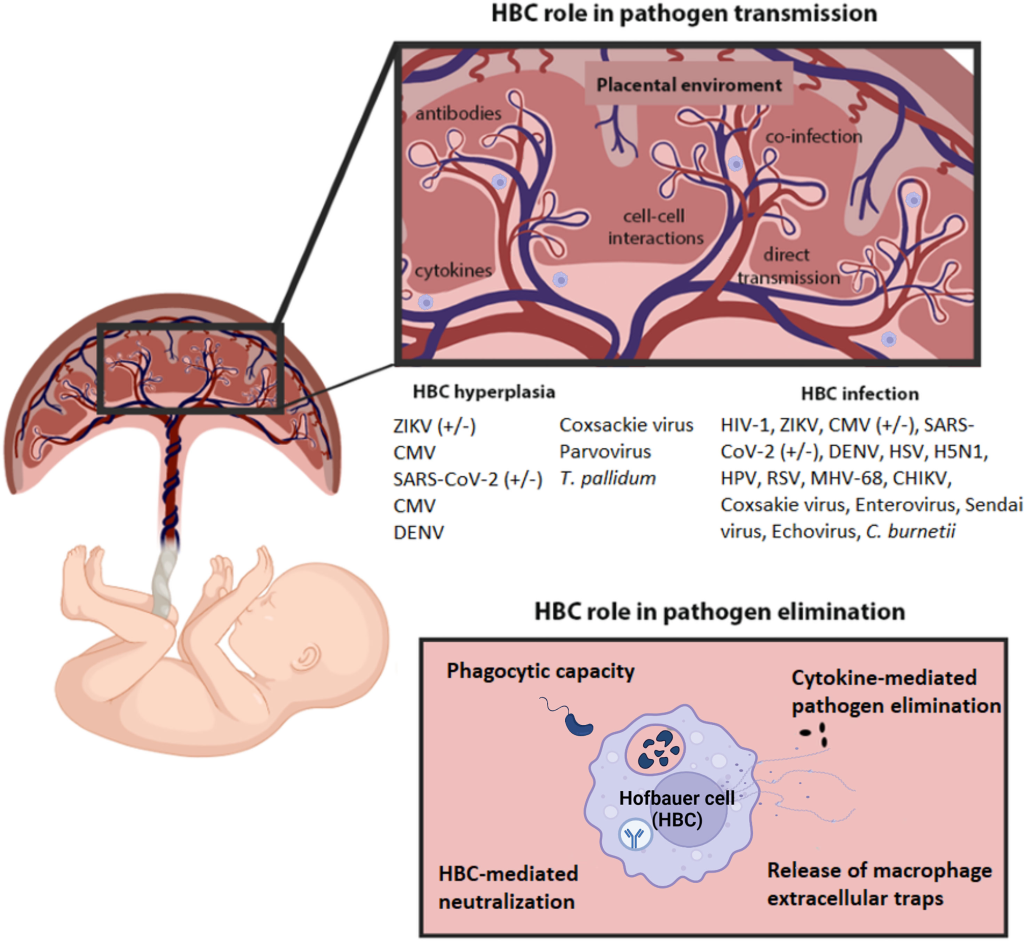 Bunların bir tür makrofaj olduklarına inanılmaktadır ve büyük olasılıkla patojenlerin anneden fetüse geçmesinin ( dikey iletim ) önlenmesinde rol oynadıkları düşünülmektedir . Plasental vaskülogenez ve anjiyogenez ile ilgili birçok çalışma bulunmasına rağmen, Hofbauer hücrelerinin bu süreçlerdeki olası rollerine ilişkin kanıt eksikliği söz konusudur.