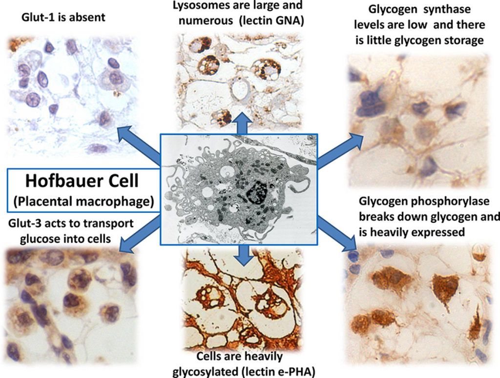 Hofbauer hücreleri, çok sayıda lizozomal vakuol ve ağır glikosile edilmiş plazma membranları ve granülleri ile fagositik aktiviteleriyle orantılı özelliklere sahiptir ve en çok gebeliğin ilk yarısında belirgindir. Karbonhidrat metabolizmaları,glikojen olarak depolamak yerine glikoz mobilizasyonuna dayanır