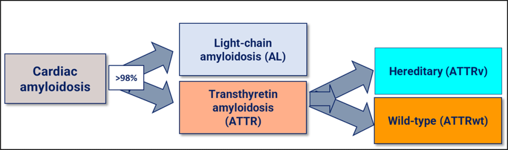 Kardiyak amiloidoz tipleri ve Transterin amiloidoz alt grupları; ATTRm-CM = mutant transthyretin amyloid cardiomyopathy; ATTRwt-CM = wild-type transthyretin amyloid cardiomyopathy; 3 Temmuz 2024 yazar drtanjuy
