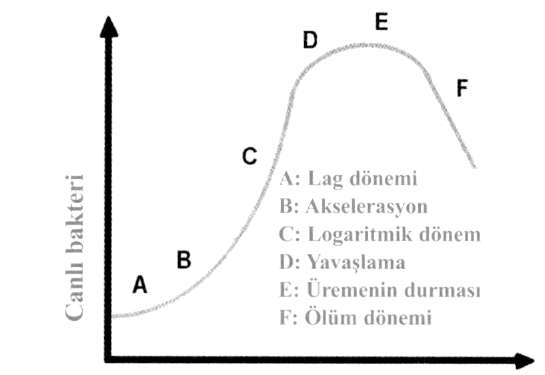F.Ölüm dönemi: Ölüm oranı artar. Bakteri sayısı hızla azalır. Bu dönemde bakterilerin bazıları aylarca canlılıklarını koruyabilirler.