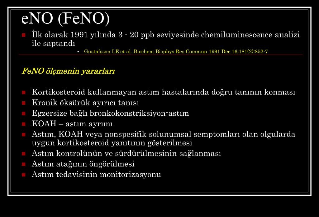 Fraksiyone Nitrik Oksit (FeNO), astımda hava yolu inflamasyonu varlığını ve derecesini belirlemek ya da tedavi başarısını izlemek için yararlı testlerden biridir
