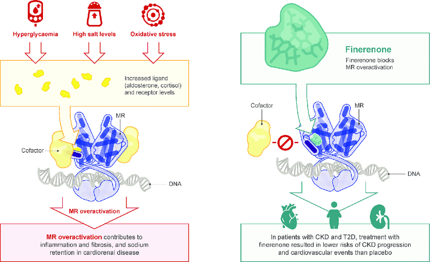 Kerendia ve Firialta marka adları altında satılan finerenone , tip 2 diyabetle ilişkili kronik böbrek hastalığı olan yetişkinlerde böbrek fonksiyonlarında düşüş, böbrek yetmezliği , kardiyovasküler ölüm , ölümcül olmayan kalp krizi ve kalp yetmezliği nedeniyle hastaneye yatış riskini azaltmak için kullanılan bir ilaçtır . Finerenone , non-steroidal bir mineralokortikoid reseptör antagonistidir (MRA)