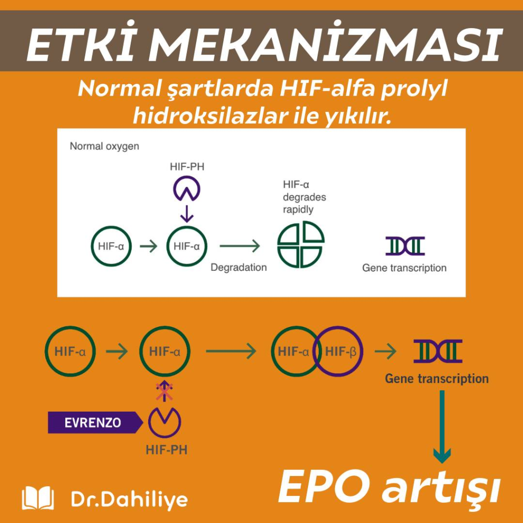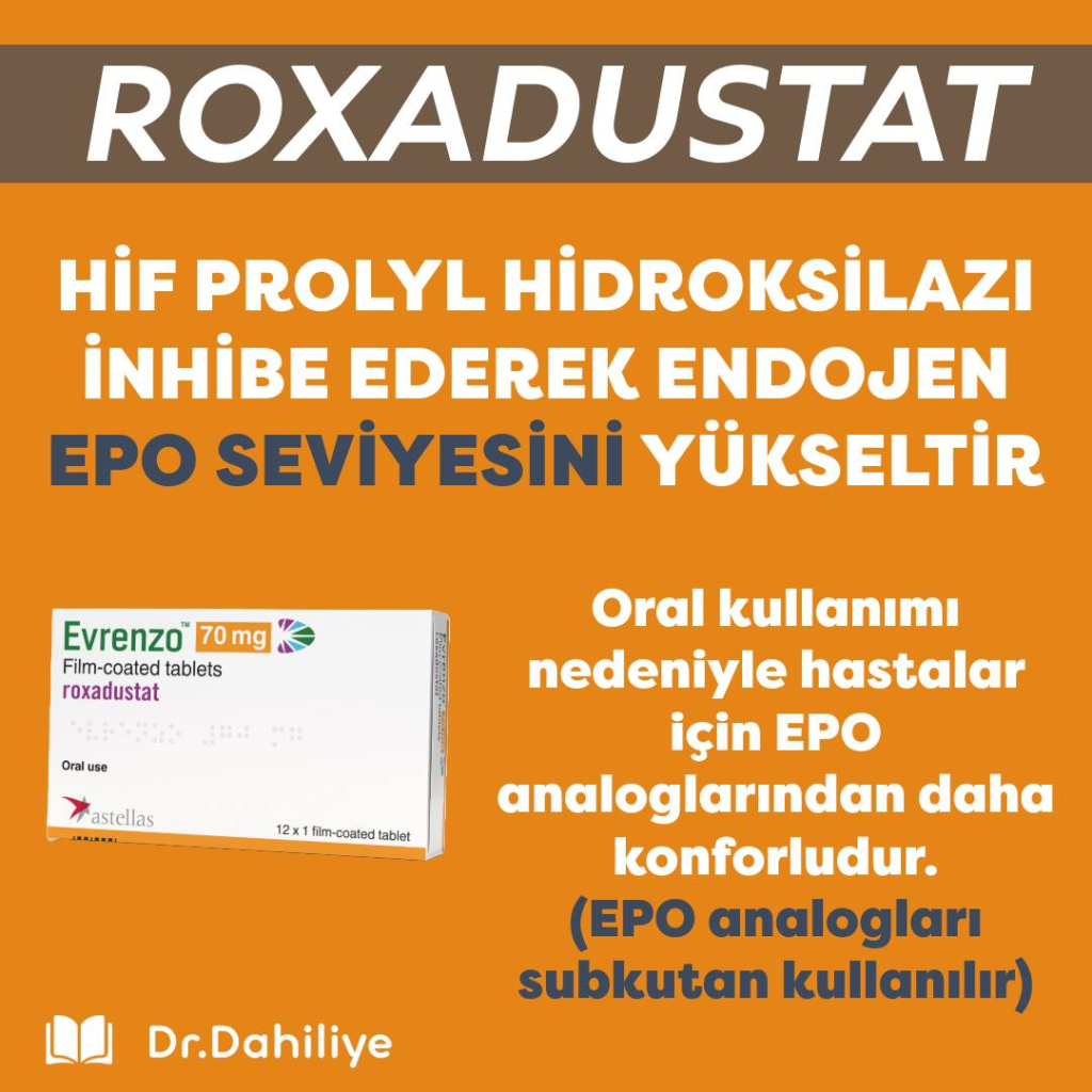 Roxadustat, HİF Prolyk hidroksilazı inhibe ederek endojen EPO seviyesini yükseltir. Bu nedenle KBY tedavisinde kullanılır 22 Temmuz 2024 yazar drtanjuy