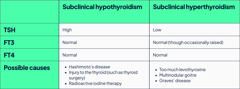NICE, TSH seviyesi 10 mIU/L’nin üzerinde olan kişilerin belirgin hipotiroidizmle aynı şekilde tedavi edilmesini önermektedir. TSH seviyesi yüksek ancak 10 mIU/L’nin altında olan ve hipotiroidizmi düşündüren semptomları olan kişilere, TSH’nin normale dönmesine rağmen semptomlar devam ederse tedaviyi durdurmayı amaçlayan bir tedavi denemesi yapılmalıdır.