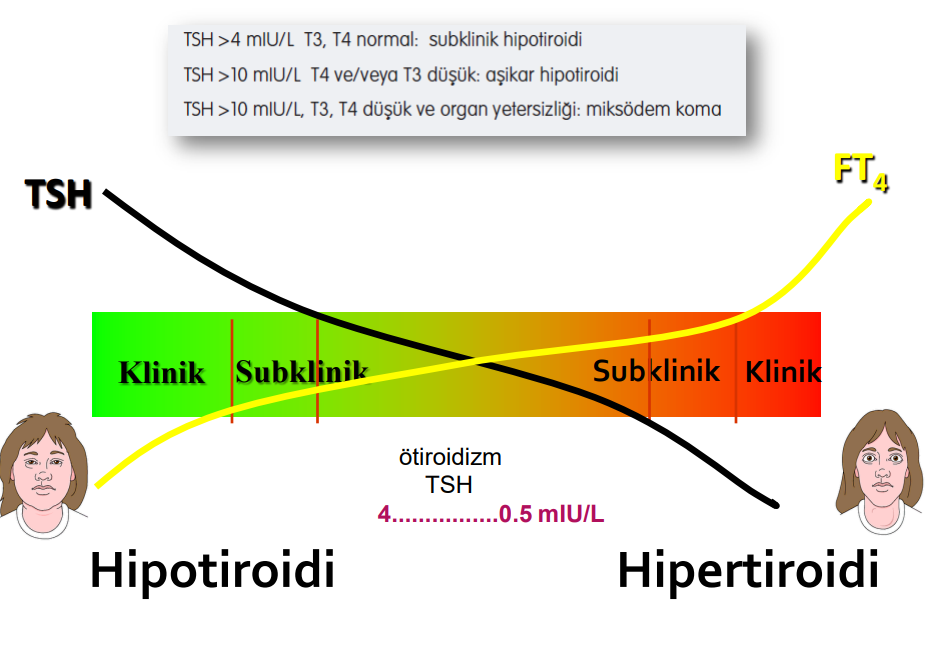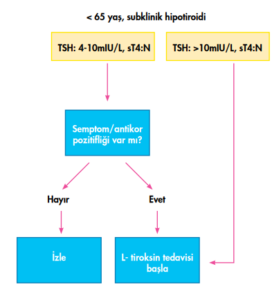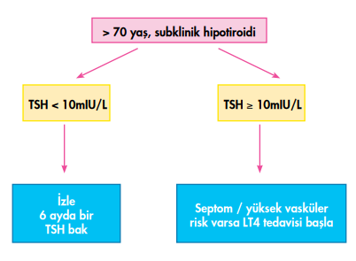 Tiroid stimülan hormon (TSH) düzeyi <10 mIU/L olan vakaların çoğu asemptomatiktir. Subklinik hipotiroidi, serum TSH düzeyinin yüksekliğine göre “TSH düzeyi hafif yüksek olanlar (4,0-10,0 mIU/L)” ve “şiddetli yüksek olanlar (>10 mIU/L)” olmak üzere iki kategoride değerlendirilmektedir.