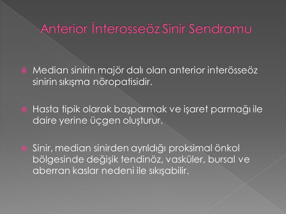 Hastalar klasik olarak baş ve işaret parmakları ile “o” harfi yapamazlar; baş parmak interfalanjial ve işaret parmağı distal interfalanjial eklemleri hiperekstansiyonda izlenir, inkomplet sendromda ise bir ve ikinci parmak fleksiyonunda zayıflama izlenir ancak pronator quadratus sağlamdır, sıklıkla FPL tutulan tek kas olur