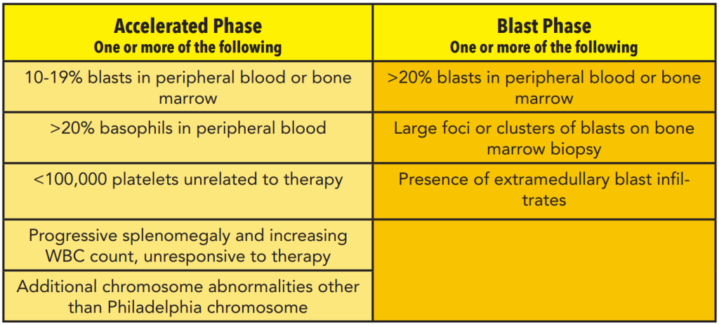 3-Blastik Faz: Blast hücreleri % 20’yi geçmişlerdir. Yorgunluk, halsizlik, ateş ve belirgin dalak büyümesi olmuşsa buna blast krizi de denir. Bu evrede hastalık akut lösemiye dönüşür. Ciltte morluklar olur, kemik ağrıları giderek artar. Hastaların hastaneye yatarak tedavi olmaları gerekir. Tedaviye yanıt oranı da düşüktür.
