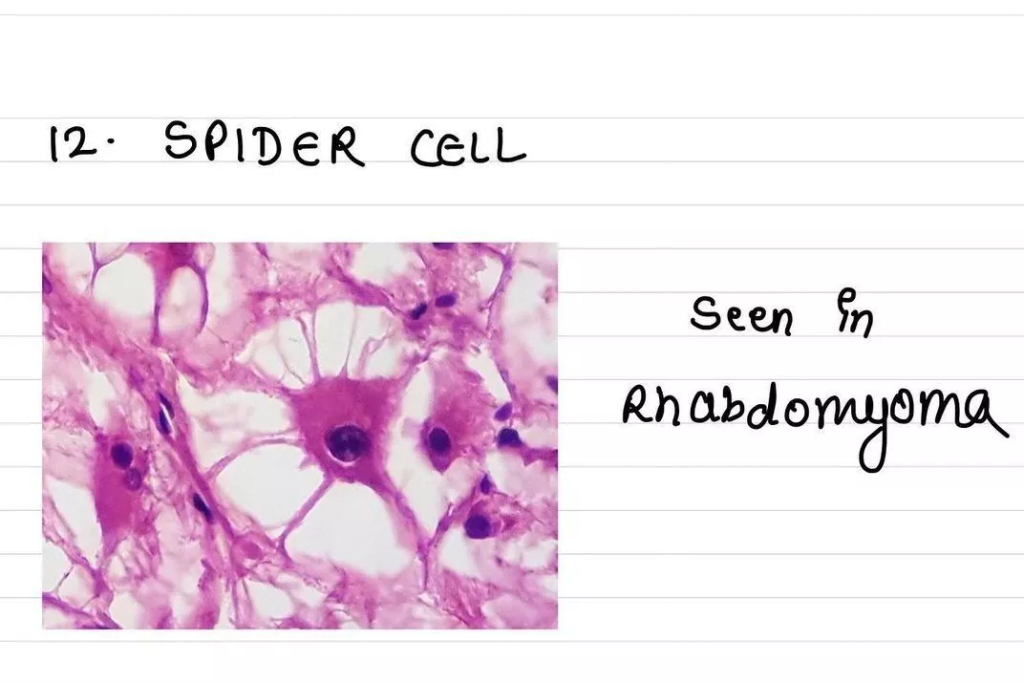 Çekirdeği yerinden oynamış, vakuollü, sitoplazmada granülasyonlar ve sitoplazmanın ince uzantıları bulunan karakteristik “örümcek hücresi” olarak da bilinir.