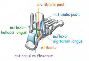 Tibial sinir , posterior tibial arter , posterior tibial ven ve fleksör tendonlar tarsal tünel boyunca bu yol boyunca bir demet halinde anteromedialden posterolaterale doğru şu sırayla ilerler: