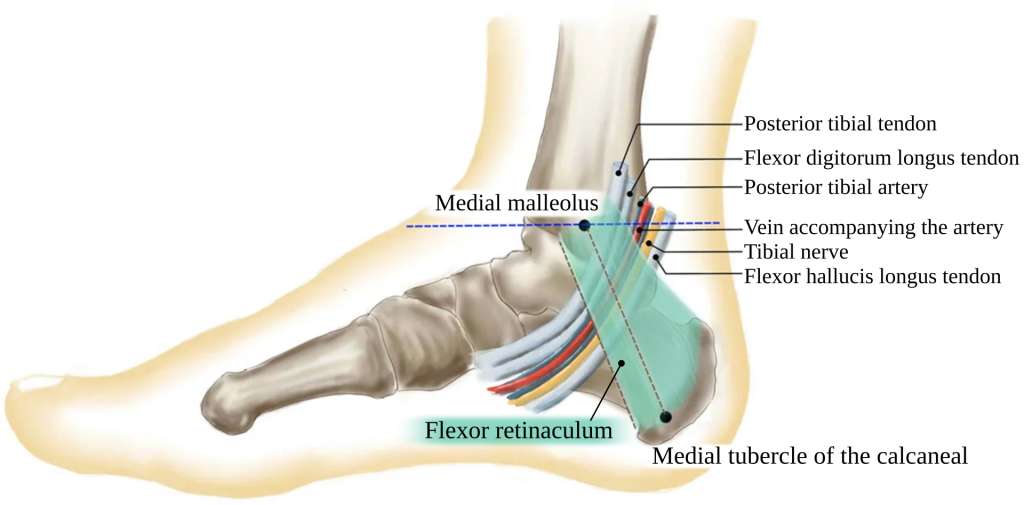 Tünelde tibial sinir üç farklı yola ayrılır. Tibial sinirin medial kalkaneal dalları topuğa kadar devam ederken, medial plantar sinir ve lateral plantar sinir ayağın tabanına kadar devam eder .