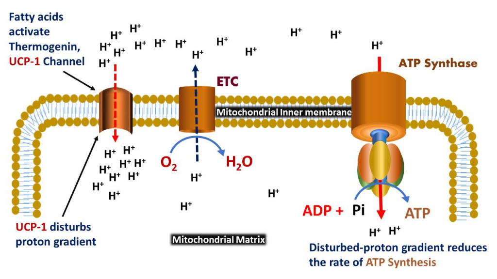 - Kahverengi yağ mitokondrisinin ATP sentaz içeriği baskılanarak, ATP sentezi yerine ayrışmaya yönelik membran potansiyeli oranı artırılır.