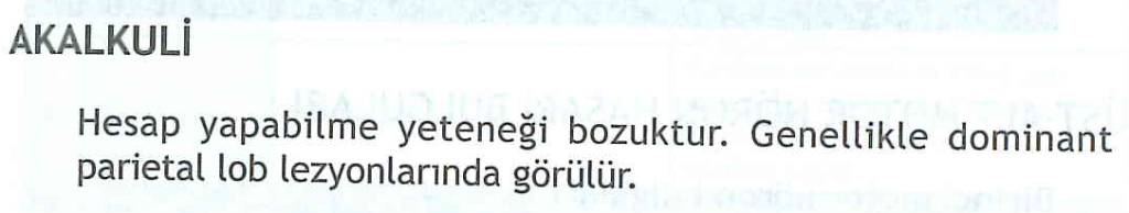 Akalkuli, dominant pariyetal lob lezyonunda görülür. Akalkuli , insanların toplama, çıkarma, çarpma ve hatta iki sayıdan hangisinin daha büyük olduğunu söyleme gibi basit matematiksel görevleri yerine getirmede zorluk çektiği edinilmiş bir bozukluktur . Akalkuli, inme gibi nörolojik yaralanmalar nedeniyle yaşamın ilerleyen dönemlerinde edinilmesi bakımından diskalkuliden farklıdır ; diskalkuli ise ilk olarak matematik bilgisi edinilirken gözlemlenen belirli bir gelişimsel bozukluktur . Adı, Yunanca “değil” anlamına gelen a- ve “saymak” anlamına gelen Latince calculare kelimelerinden gelir. Akalkuli, daha yaygın olarak bilinen ******Gerstmann sendromunun bir semptomu olduğundan , akalkuliyi tek başına teşhis etmek zor olabilir. Bunun yerine, semptomlarından biri olarak etiketlenebilir ve sonunda Gerstmann sendromunun teşhisine yol açabilir. “Genel zihinsel bozukluk ve önemli afazik bozukluğun birincil faktörler olarak dışlanabilmesi koşuluyla, agrafi, akalkuli ve sağ-sol karışıklığı gibi eksikliklerin sunumu, klinisyeni fokal posterior parietal lob hastalığı olasılığına karşı uyarmalıdır.