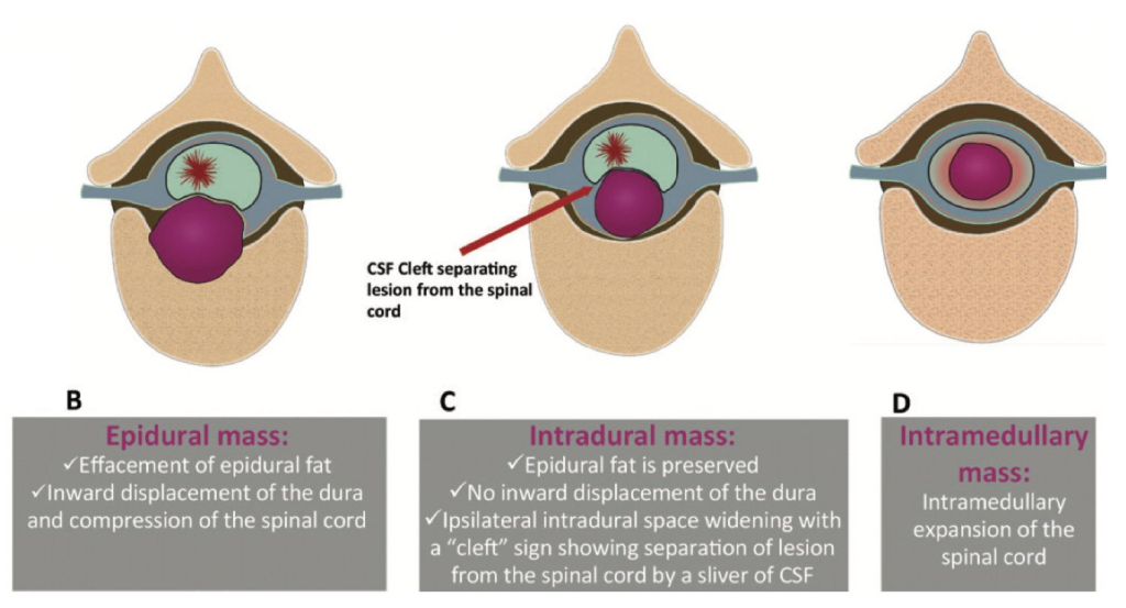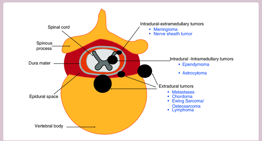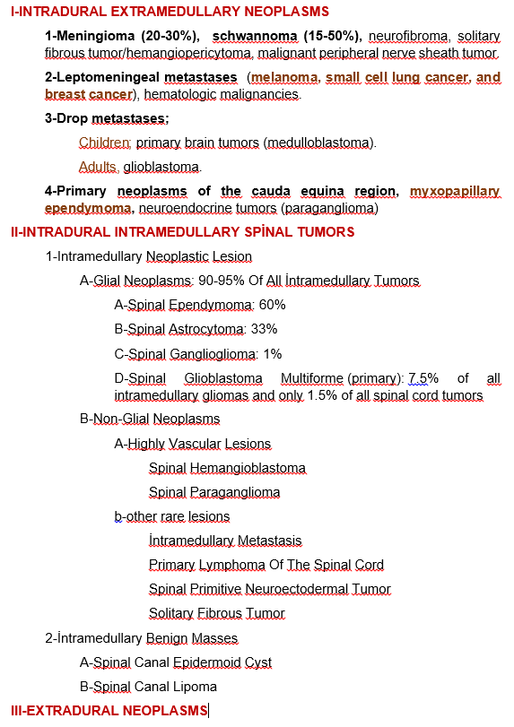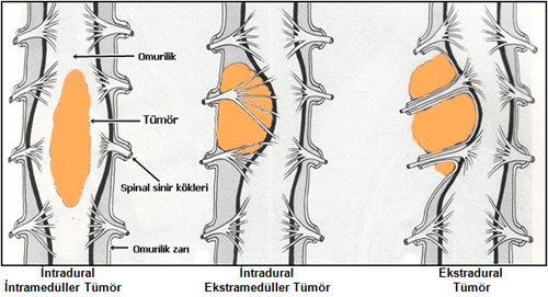 3-Ekstradural tümör; Erişkinde sıktır. Metastazlar, Kordoma, Ewing Sarcoma, Osteosarkoma ve lenfoma ile myelom (1. sırada metastazlar, 2. sırada ise myelom görülür.)