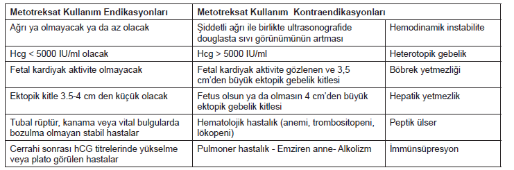 HCG değeri 5000 üzerinde olanlar veya kardiyak aktivitesi olan ektopik gebeliği olan hastalarda metotreksat mutlak kontraendike değildir. Ancak başarısızlık oranı kabul edilebilir sınırlarda olmadığı için tercih edilmemelidir.
