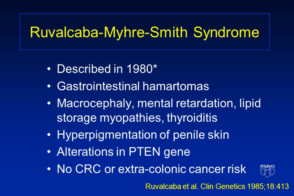 Ruvalcaba sendromu ( Ruvalcaba-Myhre-Smith sendromu); makrosefali, hipoplastik genital organlar, zihinsel (her zaman değil) ve fiziksel engellilik, kısa boy, tuhaf yüz, sıkışık dişlere sahip mikrognati, pektus karinatumlu dar göğüs kafesi, deri altı lipom, hamartomatöz bağırsak polipleri ile ilişkilidir.