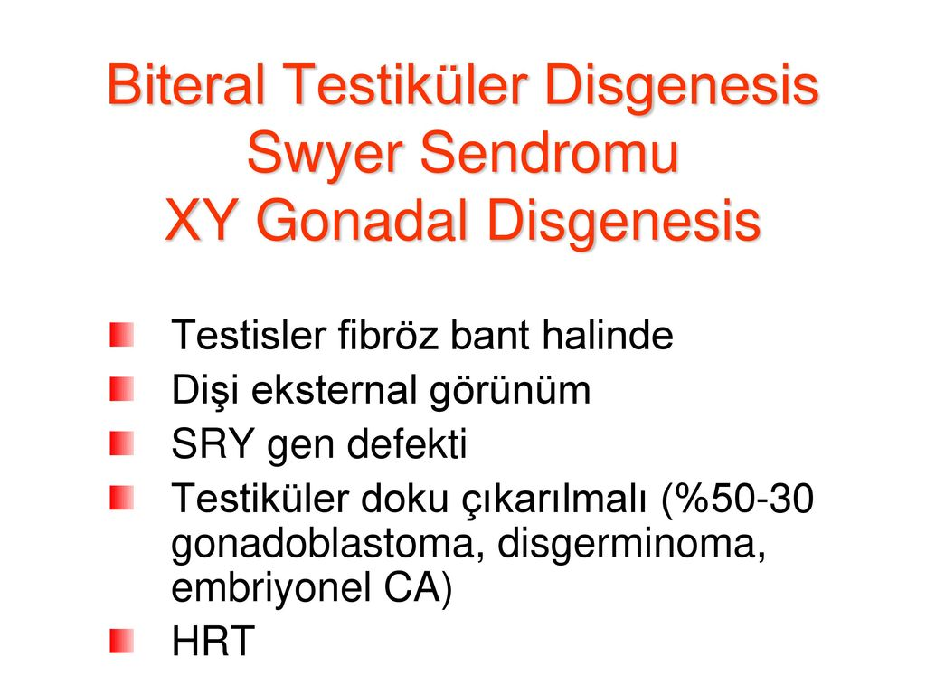Gonadotropinler yükselmiştir. Saptandığı zaman gonadoblastom gelişme riski nedeni ile gonadektomi yapılmalıdır