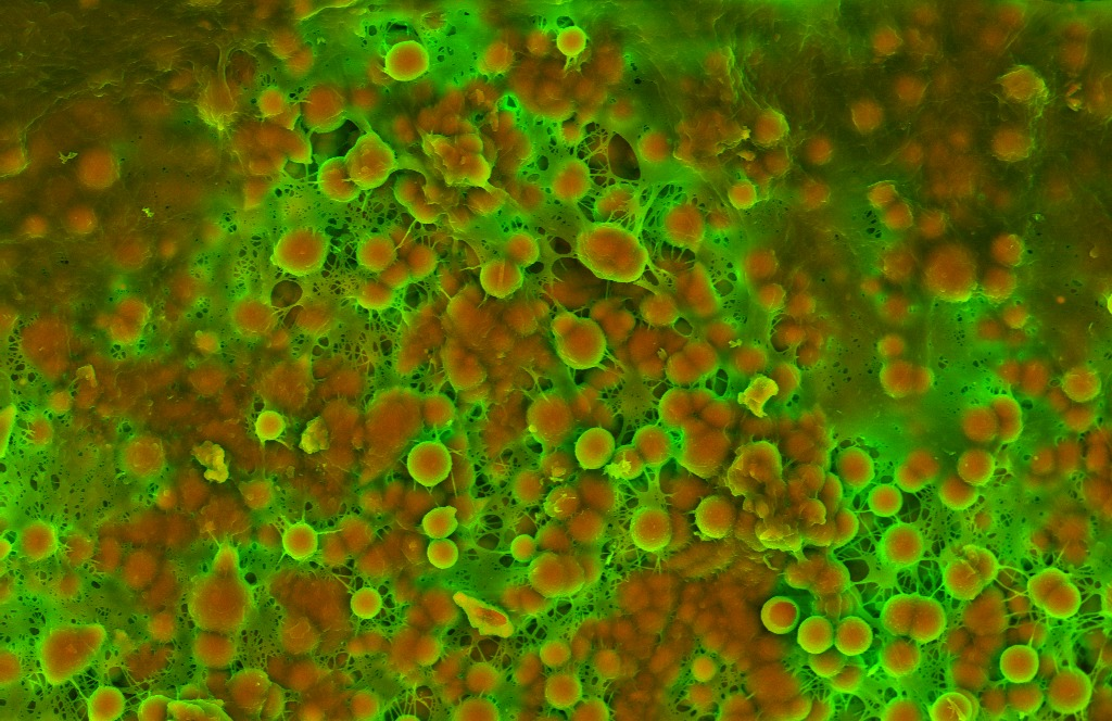 Yoğunluğa Bağlı Renkli Taramalı Elektron Mikrografı SEM (DDC-SEM) kardiyovasküler kalsifikasyon, turuncu kalsiyum fosfat küresel parçacıklarda (daha yoğun malzeme) ve yeşil renkte hücre dışı matriste (daha az yoğun malzeme) gösteriliyor.