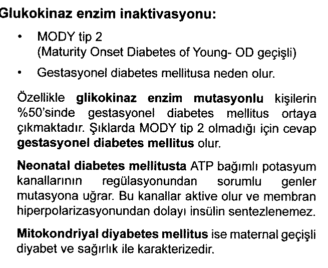 Glukokinaz enzim inaktivasyonu; MODY tip 2 ve gestasyonel diabetes mellitusa neden olur. Glukokinaz, glikozun glikoz-6-fosfata fosforilasyonunu kolaylaştıran bir enzimdir. Glukokinaz, insanlarda ve diğer omurgalıların çoğunda karaciğer ve pankreas hücrelerinde bulunur .Bu organların her birinde , glikoz sensörü olarak hareket ederek karbonhidrat metabolizmasının düzenlenmesinde önemli bir rol oynar ve glikoz seviyelerinin yükselmesine veya düşmesine yanıt olarak metabolizmada veya hücre işlevinde kaymaları tetikler, örneğin bir yemekten sonra veya oruç tutarken meydana gelir . Bu enzim için genin mutasyonları, alışılmadık diyabet veya hipoglisemi formlarına neden olabilir.