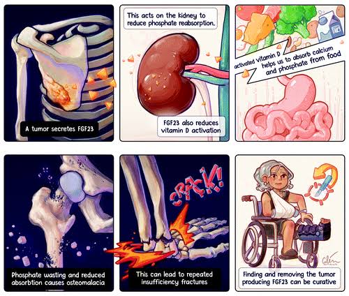 Fosfatürik mezenkimal tümörler (PMT’ler), tümör kaynaklı osteomalazi ile ilişkili neoplazmalardır. Hastalar tipik olarak kronik hipofosfatemik hiperfosfatürik osteomalazi ortamında patolojik kırıkların yanı sıra kademeli kas güçsüzlüğü, kemik ağrısı ve yürüme zorluğu ile ortaya çıkarlar.