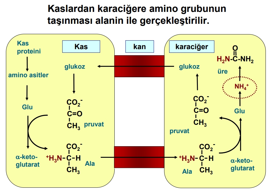 Kaslardan karaciğere amino grubunun taşınması alanin ile gerçekleştirilir.