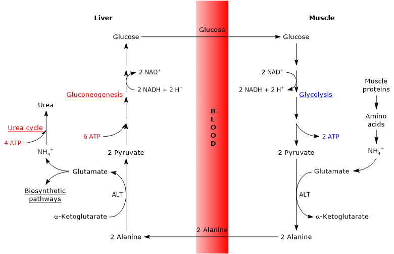 İskelet kası, dallı zincirli amino asitlerin parçalanmasıyla oluşan amonyum iyonlarını güvenli bir şekilde atmak için üre döngüsünü kullanamadığından, bundan farklı bir şekilde kurtulmak zorundadır. Bunu yapmak için amonyum, hücrede bir transaminasyon reaksiyonu yoluyla serbest α-ketoglutarat ile birleşerek glutamat ve α-keto asit üretir. Glutamik-pirüvik transaminaz (GPT) olarak da bilinen alanin aminotransaminaz (ALT), daha sonra glutamatı tekrar α-ketoglutarat haline getirir, bu sefer amonyumu glikolizden kaynaklanan pirüvata aktararak serbest alanin oluşturur. Alanin amino asidi bir mekik görevi görür – hücreyi terk eder, kan dolaşımına girer ve karaciğerdeki hepatositlere gider, burada esasen tüm bu süreç tersine döner. Alanin, serbest α-ketoglutarat ile bir transaminasyon reaksiyonuna girerek glutamat üretir, daha sonra bu glutamat deamine edilerek pirüvat ve nihayetinde serbest amonyum iyonu oluşturur. Hepatositler, üre döngüsü ile toksik amonyumu metabolize edebilir ve böylece güvenli bir şekilde atabilirler. Kas hücrelerini amonyum iyonundan başarıyla kurtardıktan sonra, döngü daha sonra enerjiden yoksun iskelet kası hücrelerine glikoz sağlar. Hepatositlerde glutamatın deaminasyonundan oluşan pirüvat, glikoz oluşturmak için glukoneogeneze uğrar ve bu daha sonra kan dolaşımına girebilir ve iskelet kası dokusuna taşınabilir ve böylece ona ihtiyaç duyduğu enerji kaynağını sağlayabilir.