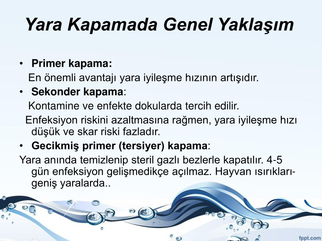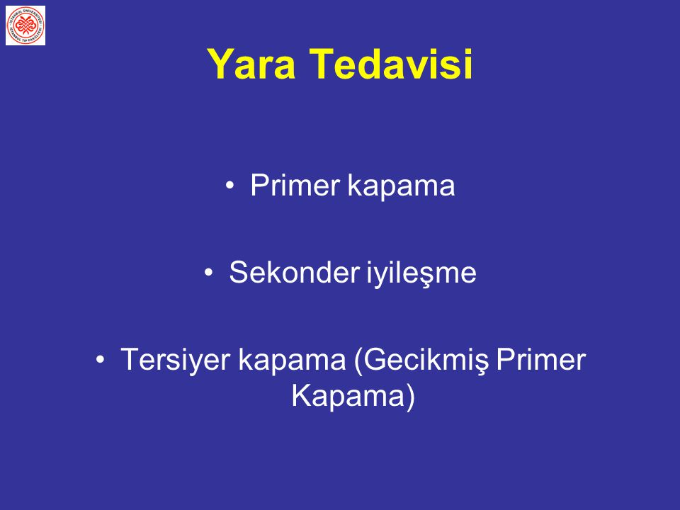 3. Tersiyer (Gecikmiş Primer) yara iyileşmesi: Doku hasarının geniş olduğu ve ciddi bakteri kontaminasyonu olan yaralardır. Bu tip yaralarda yara alanı hemen kapatılmaz. Yara yatağındaki enflamatuvar sürece, bakteri konsantrasyonunu en aza indirmek için zaman tanınır. Daha sonra primer kapama uygulanarak, yara iyileşmesinin normal biyolojik süreçleri yaşanır.