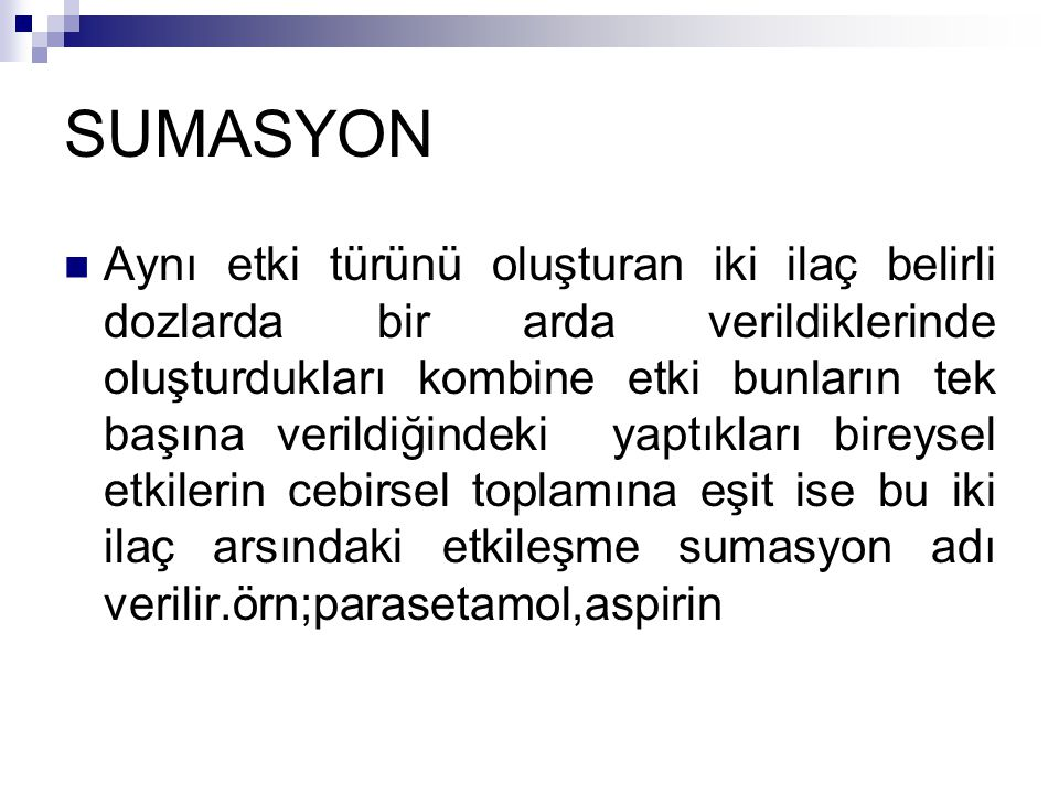 3-Sumasyon (Aditif Etkileşme): Benzer etkiyi oluşturan ilaçlar, birlikte verildiklerinde oluşturdukları kombine etki, bunların tek başlarına verildikleri zaman yaptıkları bireysel etkilerin cebirsel toplamına eşit ise; bu etkileşim aditiftir.