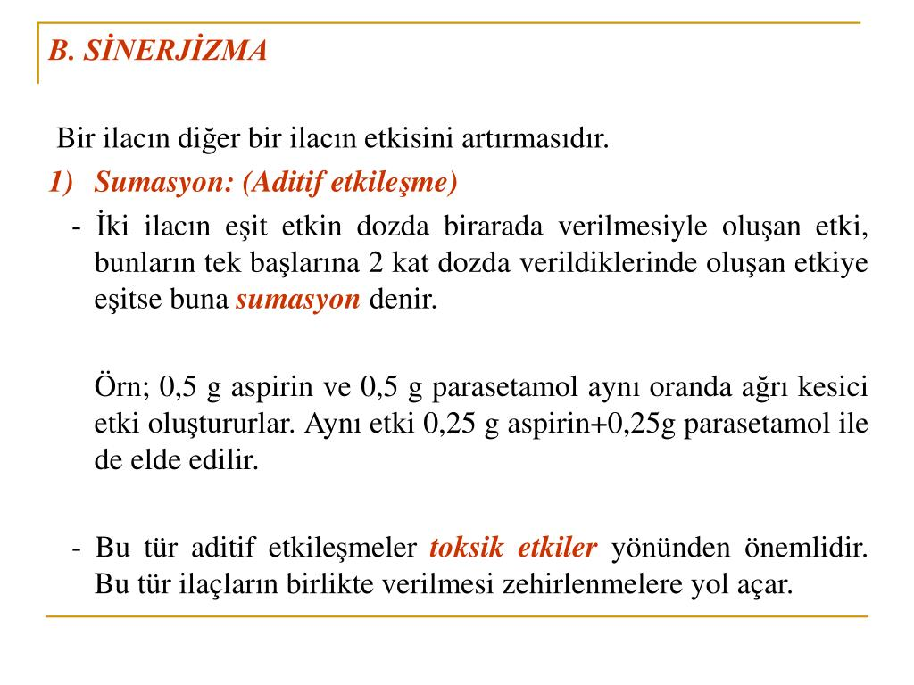 1-Sinerjizm: İki ilaç bir arada verildiğinde oluşturdukları kombine edilen miktarı, bireysel olarak oluşturdukları etkilerin toplamından fazladır. Fakat burada her iki ilaç da etkilidir. ÖR: alkol ve karbon tetraklorür,,KC tok.