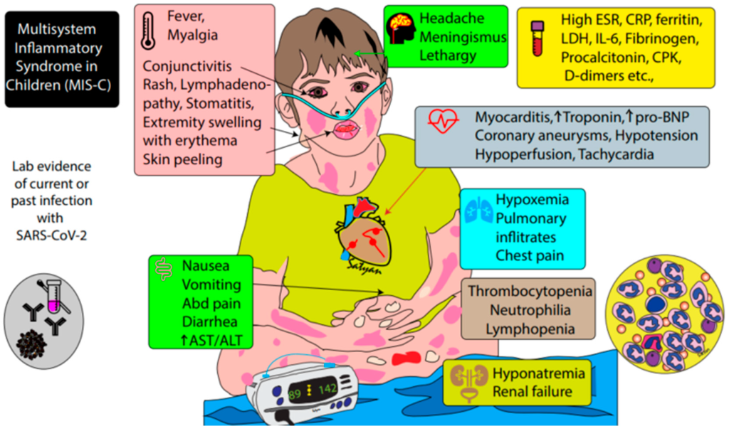 2. Destek Tedavileri: Şok varsa: IV sıvı, inotrop desteği (epinefrin, milrinon)Antikoagülasyon: Aspirin (düşük doz) LMWH (D-dimer çok yüksek veya EF düşükse) Antibiyotik: Bakteriyel enfeksiyon dışlanana kadar başlanır (empirik)Takip ve İzlem Ekokardiyografi : Başlangıçta + 1. hafta + 1 ayda tekrarlanırKalp fonksiyonu , EF , koroner arterler değerlendirilirAritmi riski açısından EKG önerilirPrognoz Zamanında tedaviyle prognoz genellikle iyidir . Miyokardit %50’den fazlasında görülür ama genellikle geri dönüşlüdür . Uzun dönem izlem (kardiyoloji) önerilir.Klinik Senaryo Örneği (Sınav İpucu) 10 yaşında çocuk, 3 gündür yüksek ateş, karın ağrısı, döküntü, halsizlik ve konjonktivit ile başvurur. Lökopeni, D-dimer ↑↑, ferritin ↑, troponin ↑ SARS-CoV-2 antikoru pozitif ➤ Tanı: MIS-C ➤ Tedavi: IVIG + steroid + destek