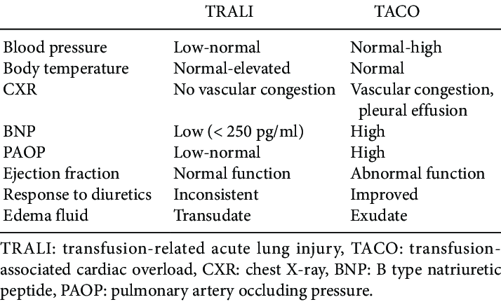 - BNP Düzeyi: TACO’da kalp yetmezliğine bağlı olarak BNP seviyeleri belirgin şekilde yükselir, TRALI’de ise normal veya hafif yüksek olabilir.