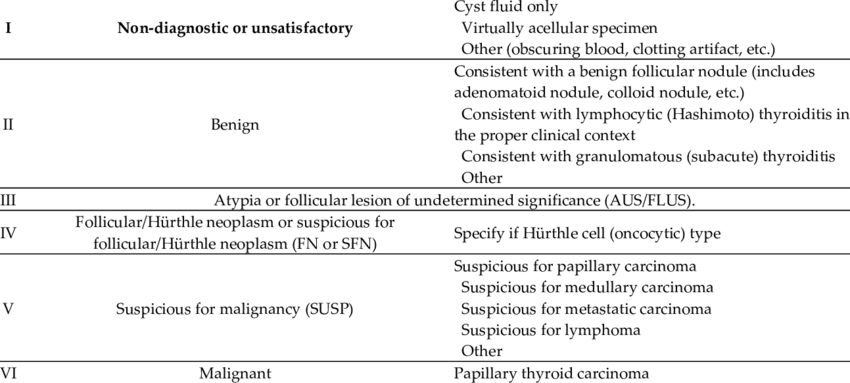- Papiller tiroid kanseri gibi maligniteye dair güçlü belirtiler içerir, ancak kesin olarak malign tanısı konulamaz.