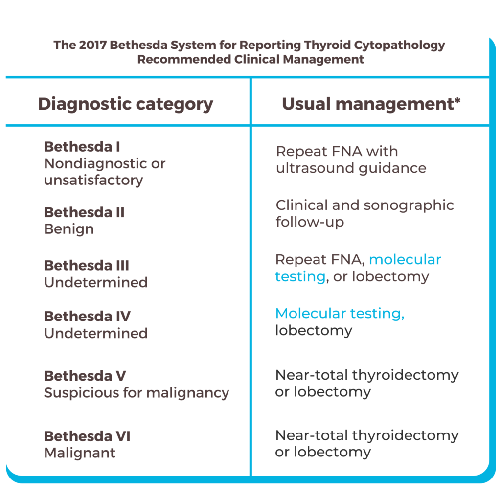 | Follicular Neoplasm (IV) | ~30 % (23–34) | Moleküler test veya diagnostik lobektomi |