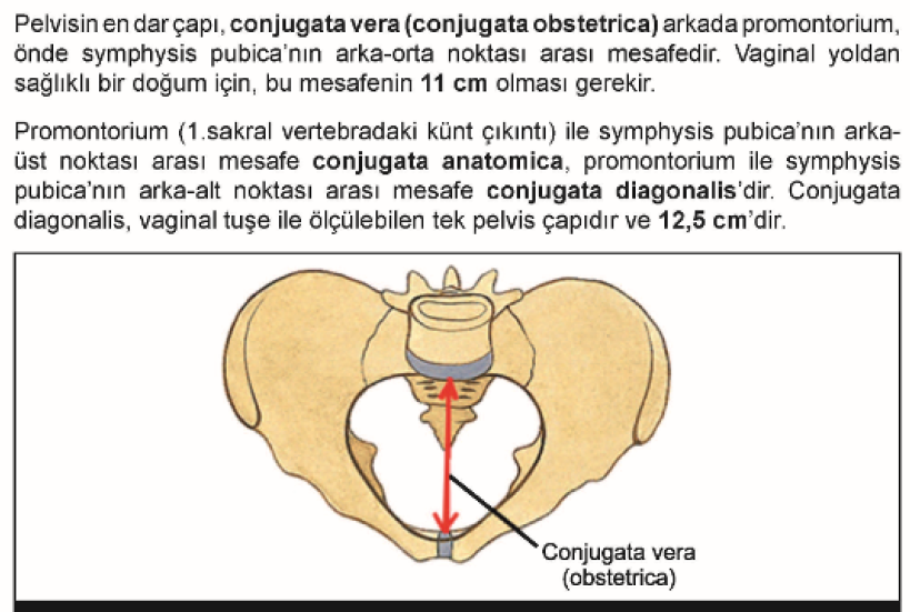 - Conjugata vera obstetrica: Gerçek doğumla ilgili olan; conjugata diagonalis – 1.5 cm formülü ile hesaplanır (~10.5–11 cm).