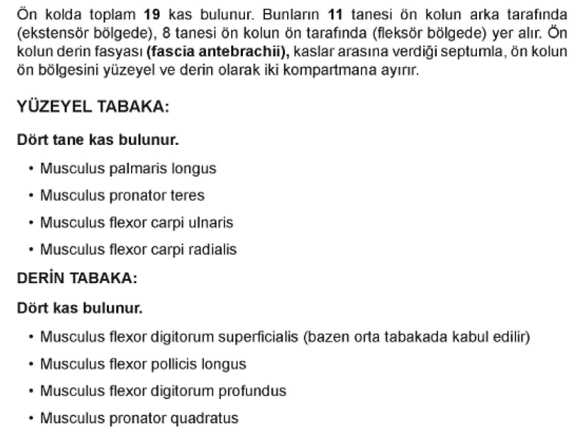 Ön kolun derin fasyası (fascia antebrachii) → yüzeyel ve derin tabaka olarak ayırır.