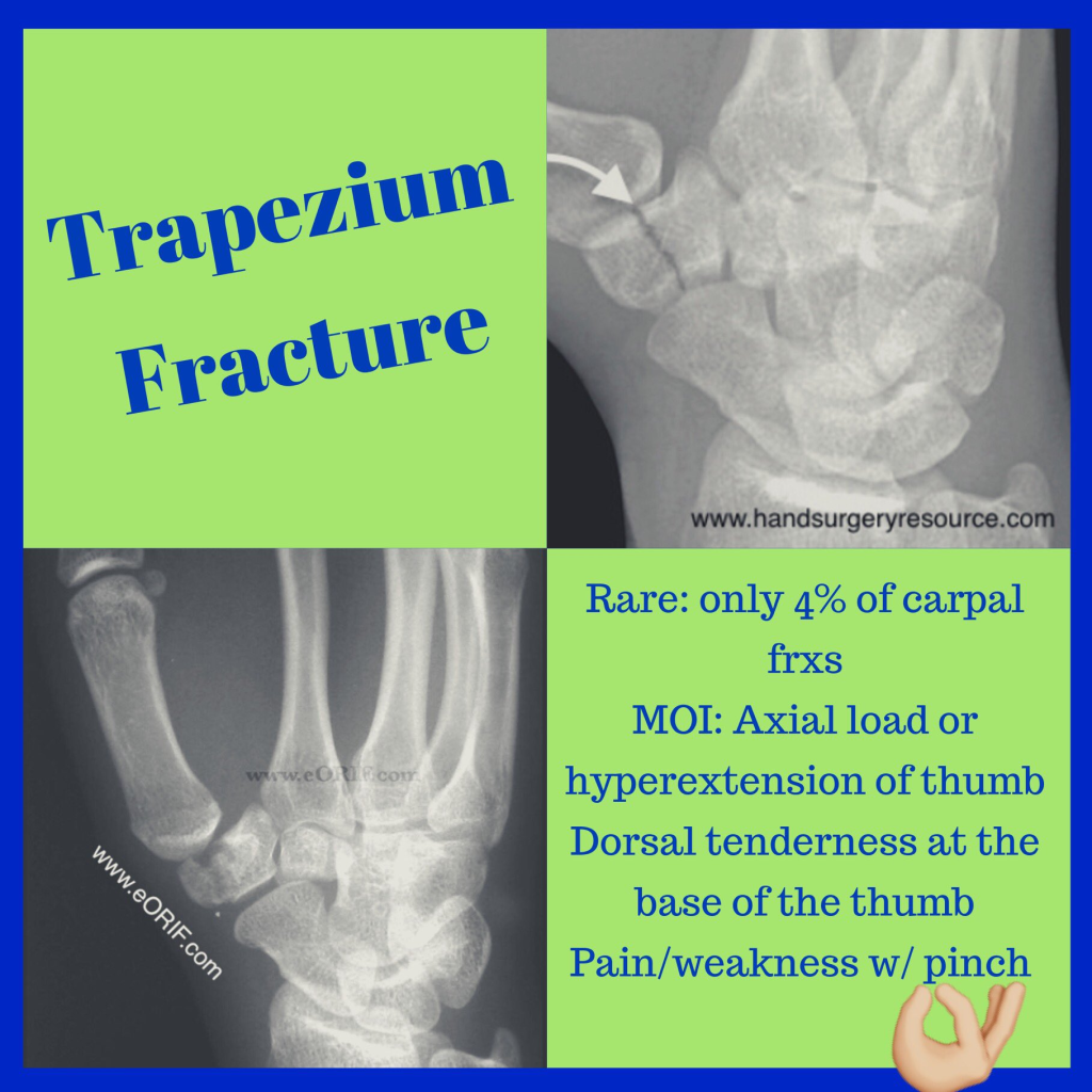 Trapez kırıkları nadir görülen karpal kemik yaralanmalarıdır. Tek başına veya başka bir karpal kemik yaralanmasıyla birlikte ortaya çıkabilirler.