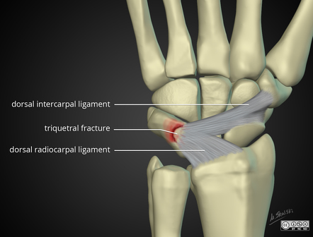 Düz filmde, dorsal kopma yaralanmaları en iyi şekilde lateral projeksiyonda tespit edilir; burada tipik olarak triquetral kemiğin arkasında uzanan kopmuş bir kemik parçası görülür (kaka yapan ördek işareti ). BT veya MR, kopma yaralanmalarının tespiti için geleneksel radyografilerden daha hassas olabilir.