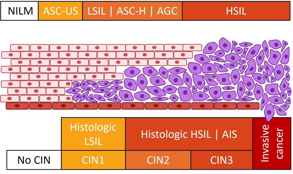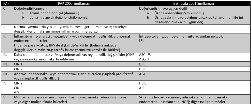 | Tanım | Atipik görünen fakat anlamı belirsiz skuamöz hücreler | Hafif displazi / CIN 1 | Orta–ağır displazi / CIN 2–3 | HSIL dışlanamayan atipik skuamöz hücreler | Atipik glandüler hücreler, endoservikal veya endometrial |
