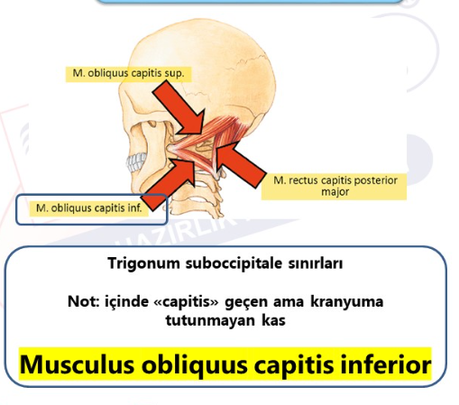 📌 M. rectus capitis posterior minor ÜÇGENİN SINIRINA KATILMAZ, ancak üçgene çok yakındır.