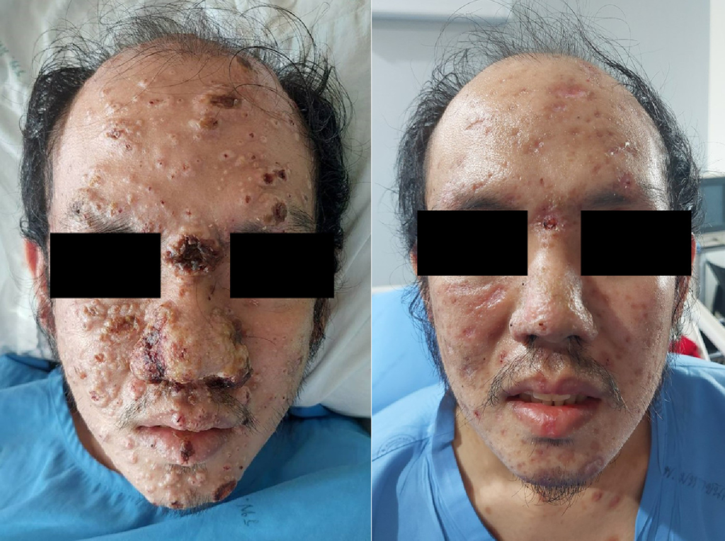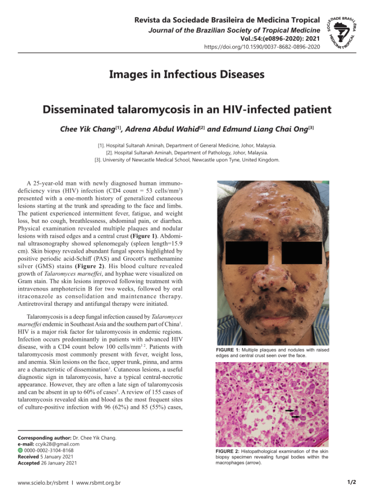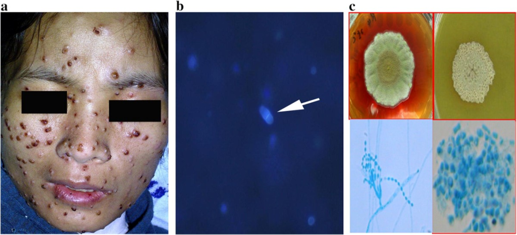 Talaromikoz, yüz ve boyunda ağrısız deri lezyonları , buna eşlik eden ateş, anemi ve lenf bezleri ile karaciğerde büyüme ile kendini gösteren bir mantar enfeksiyonudur .