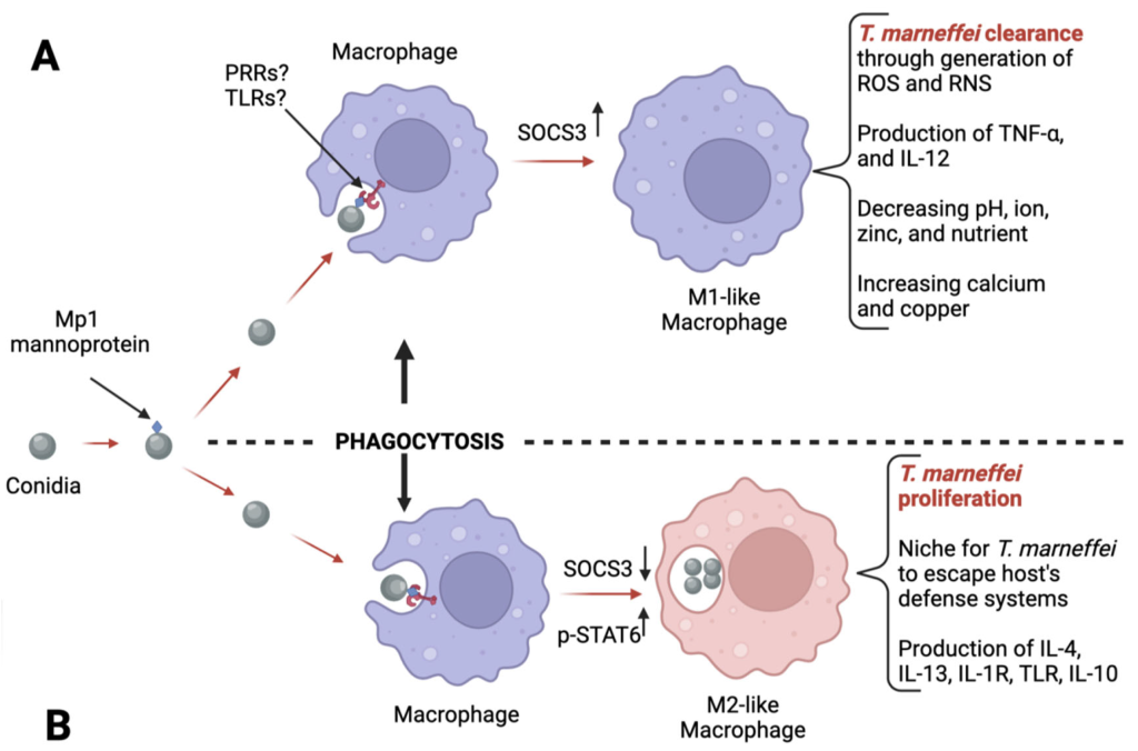 HIV/AIDS , kanser , organ nakli , uzun süreli steroid kullanımı , yaşlılık, yetersiz beslenme veya otoimmün hastalık gibi durumlar nedeniyle bağışıklık sistemi zaten zayıflamış kişiler genellikle bu enfeksiyonu kapmaktadır. Genellikle sağlıklı insanları etkilemez ve kişiden kişiye bulaşmaz. Tanı genellikle klinik örneklerden mantarın mikroskopi veya kültür yoluyla tanımlanmasıyla konulur. Deri lezyonları, lenf düğümleri ve kemik iliği biyopsileri, histopatolojide organizmaların varlığını göstermektedir . Tıbbi görüntüleme, akciğerlerde gölgeler ortaya çıkarabilir. Hastalık, tüberküloz ve histoplazmoza benzer görünebilir .