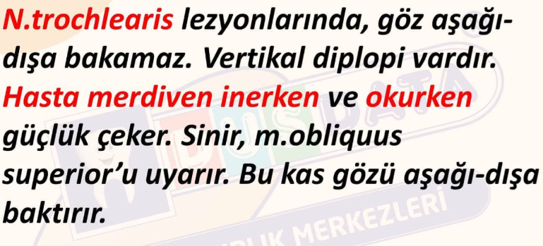 N. trochlearis lezyonunda göz aşağı-dışa bakamaz yani vertikal diplopi görülür. Hasta merdiven inerken ve okurken güçlük çeker. 18 Aralık 2025 yazar drtanjuy